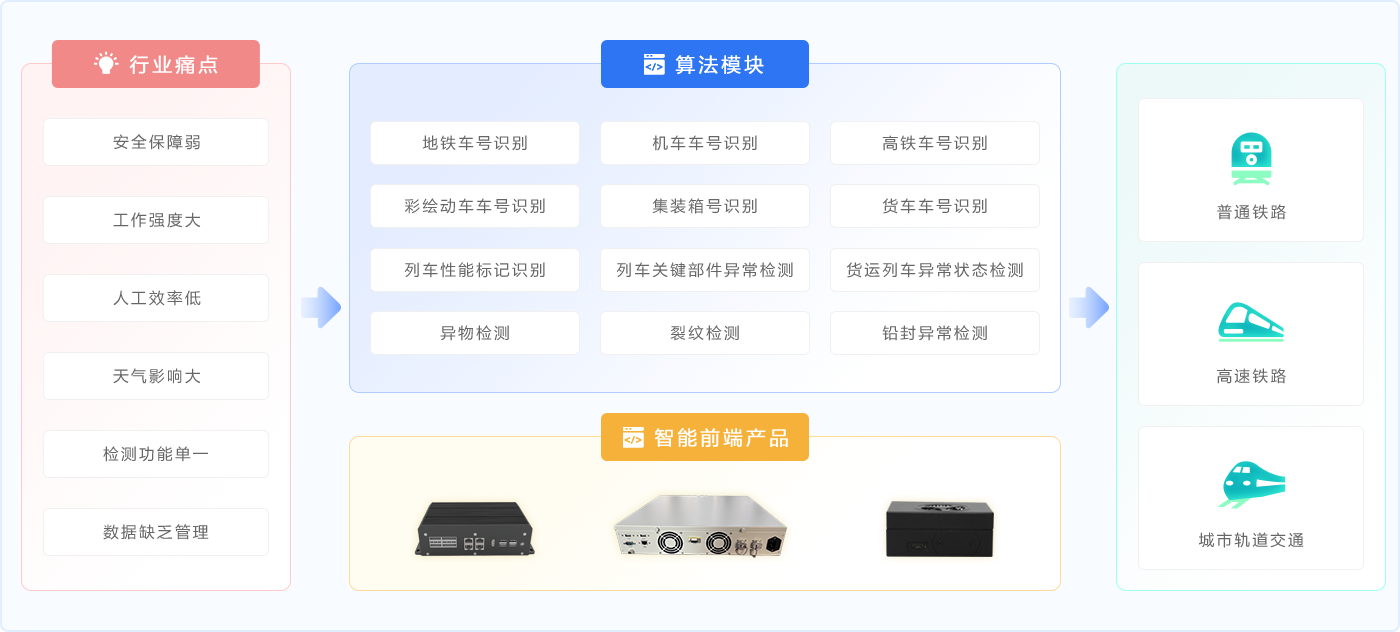 智能铁路解决方案是以轨边动态视频为基础,以“智能硬件+AI算法”为核心,聚焦铁路列车运维场景,对列车外观可视图像进行全维的智能分析,实现列车车号识别、集装箱号码识别、货运列车异常状态检测、列车性能标记识别、列车关键部件异常检测等,助力动车、机辆、货运、城市轨道交通等列车运维的智能化发展。